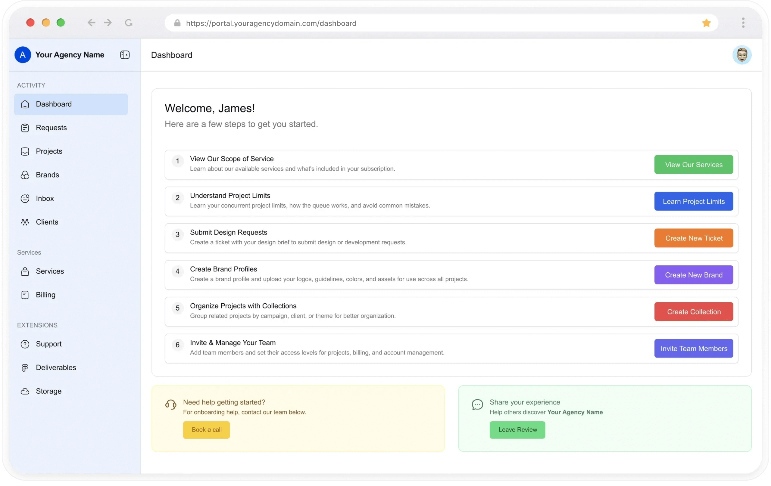 Custom domain and branding make you appear as a full-service agency with in-house design capabilities.